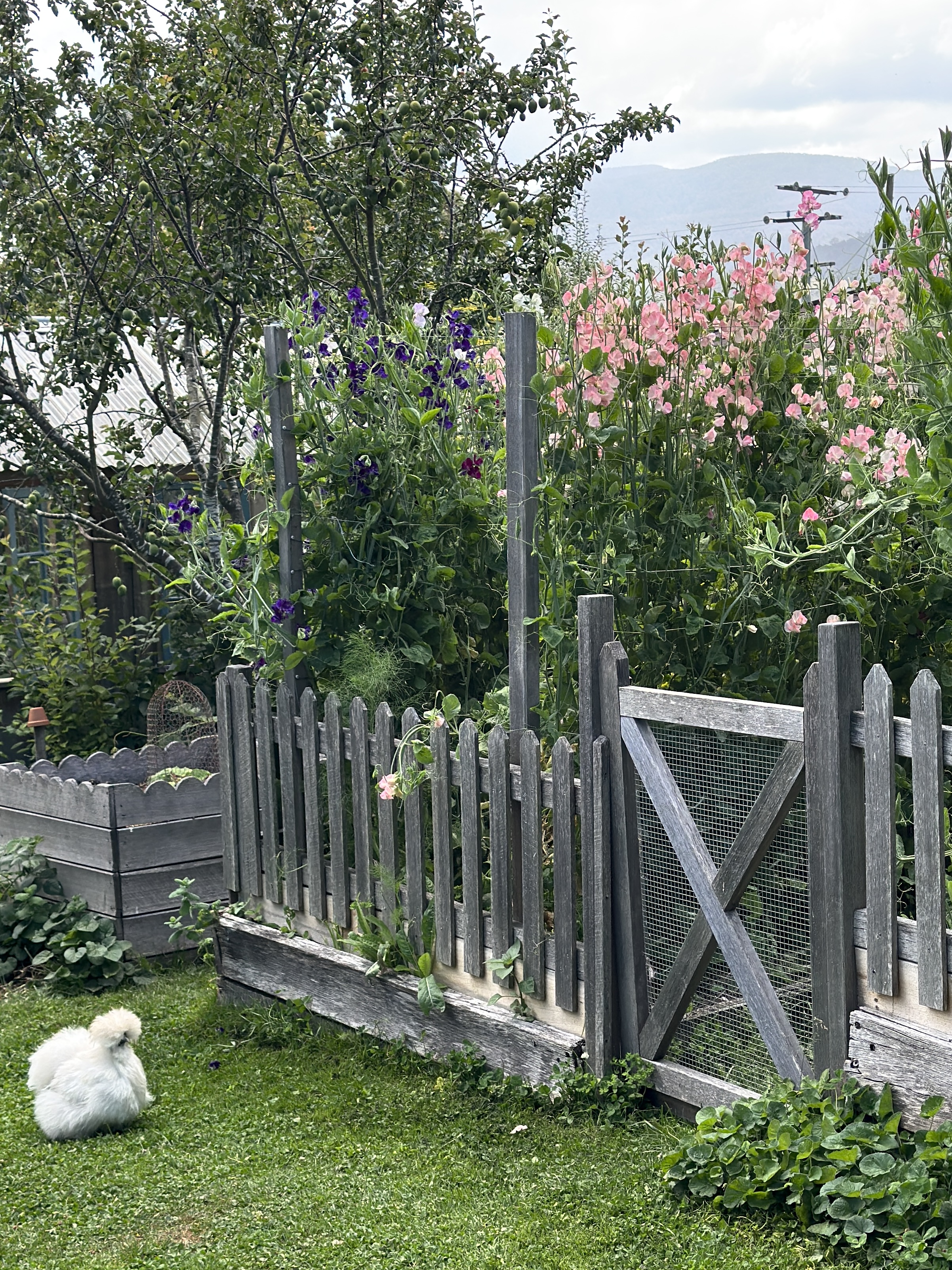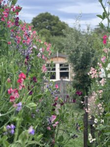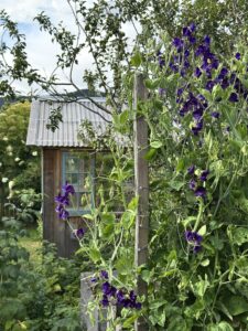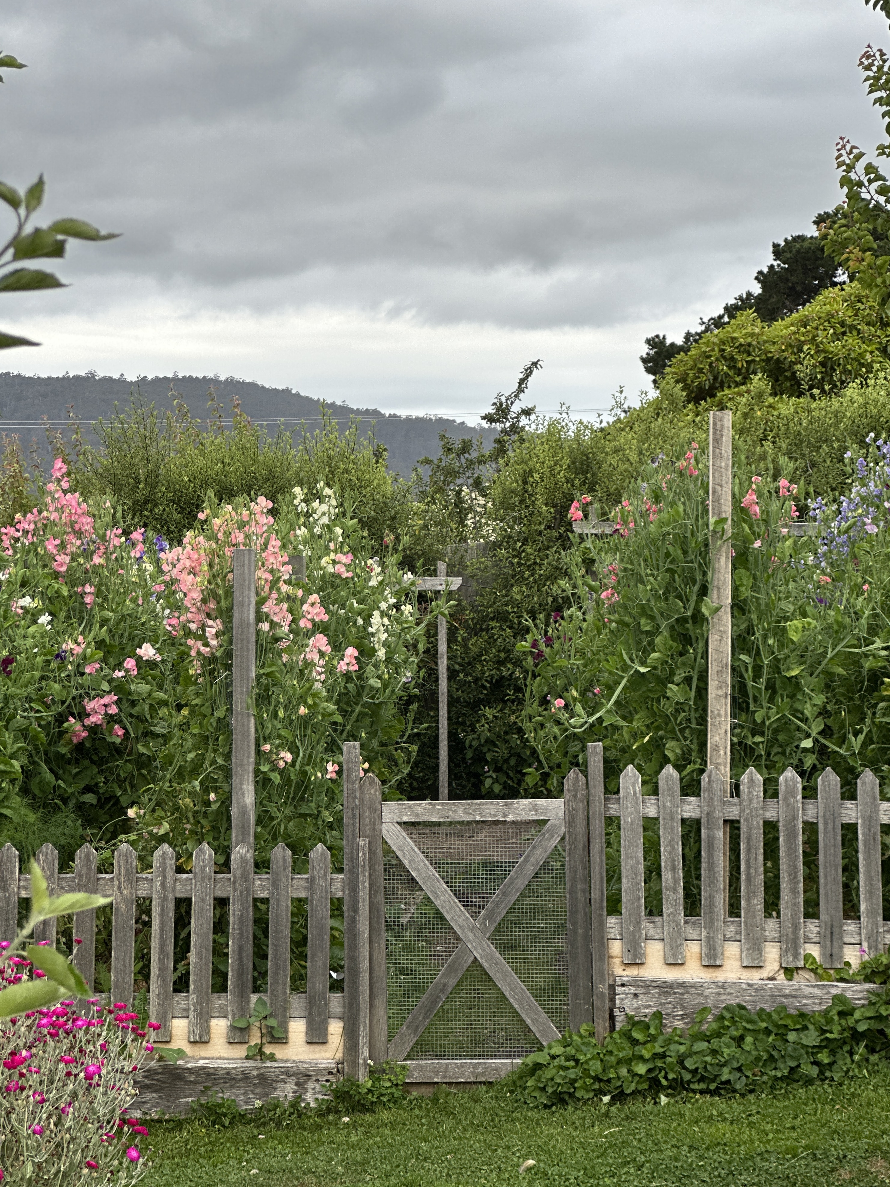 I pick a mix of flowers and foliage. Snipping the foliage back when it is getting a bit unruly helps keep everything in place amongst the sweet pea rows.